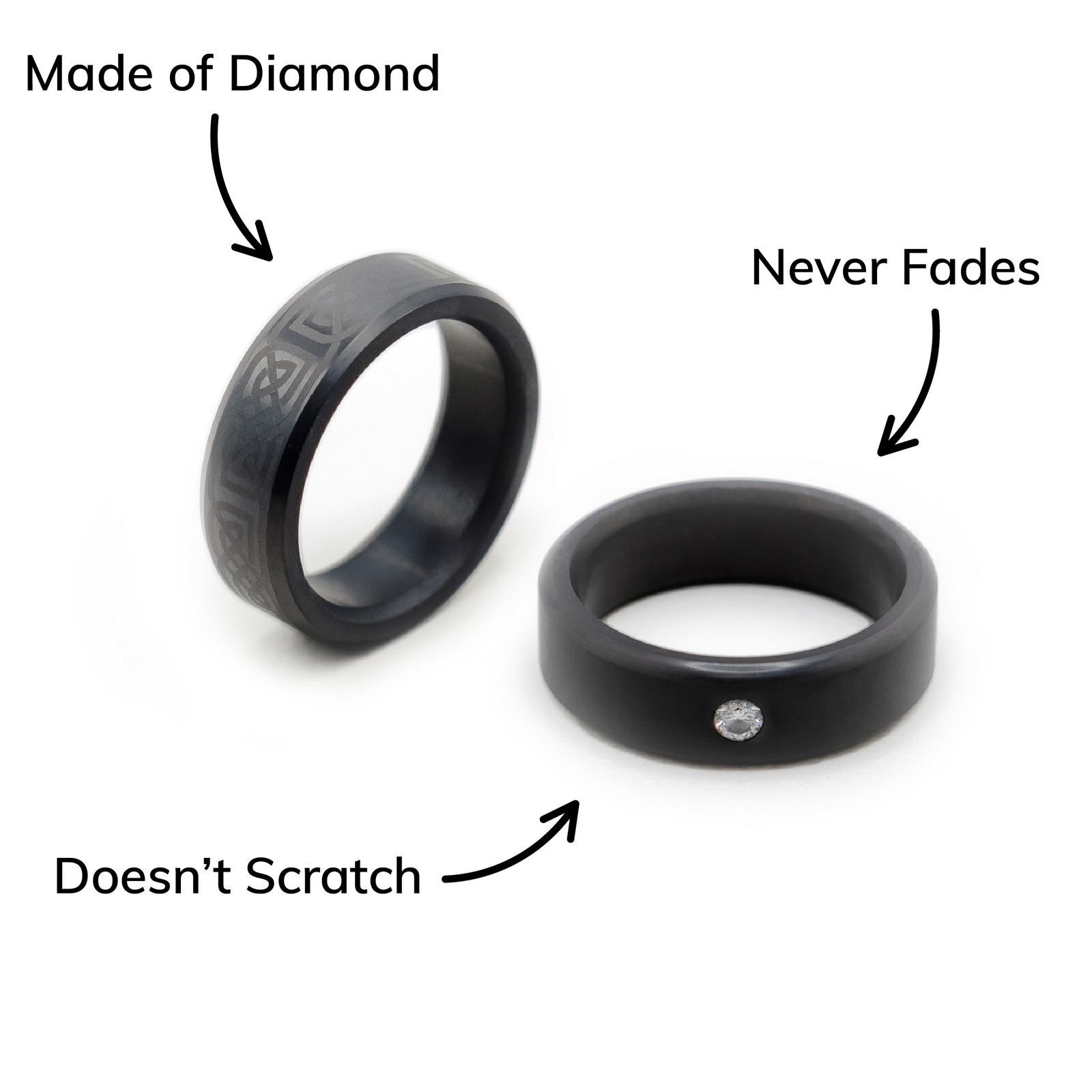 This ring is rated a 10 on the Mohs scale, making it the hardest and most scratch-resistant ring available on Earth. With a unique black color, achieved through a $30 million research and technology process, this ring offers an exquisite and enduring symbol of your commitment.